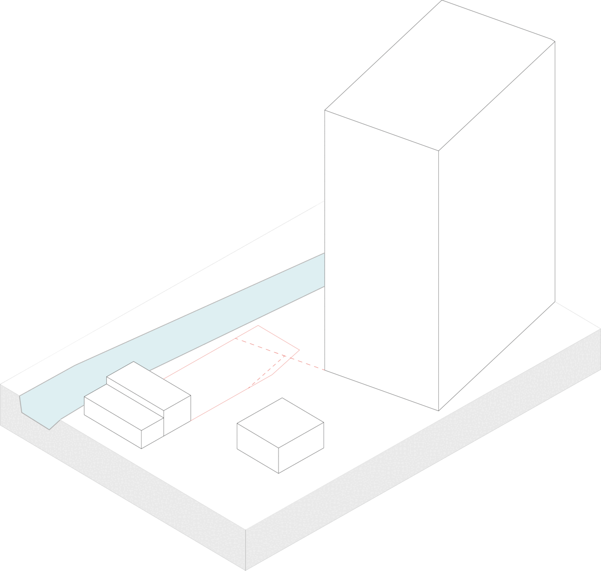The project location is one of the most densily built aeas of Yerevan. Its surroundings have a very diverse urban fabric ranging fromsoviet residential blocks and shopping markets to densely packed housing units and garages alongside Getar river. The office building is located on the site of an soviet-era boiler building. To utilize the site in its full capacity, the building is supported by a steal structure along its perimeter without any columns in the interior. Vertical communications and toilets are all located inside the yellow box, while glass facades bring the natural light to the working areas.