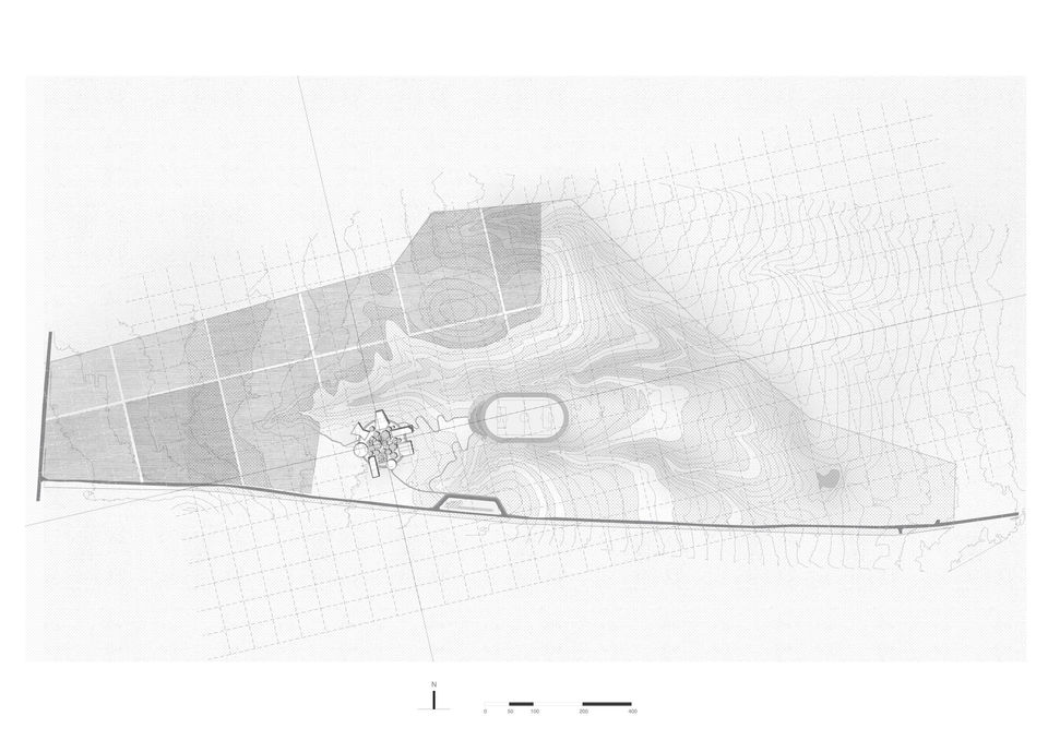 Roughly at the center of the 90-hectare site, there’s a natural semicircular plateau—an ideal spot for a 96-meter circular plan. It’s near the main road, on relatively flat ground, and well-positioned for future expansion.